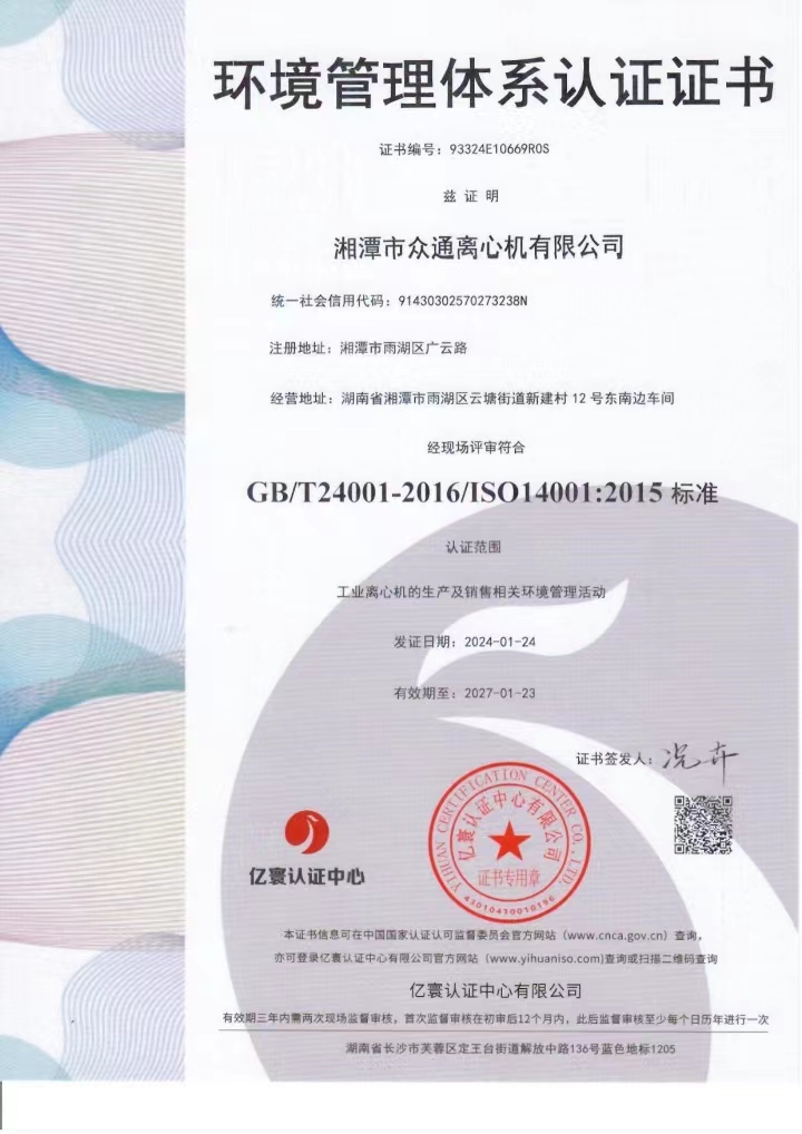 湘潭眾通離心機環(huán)境管理體系認證證書